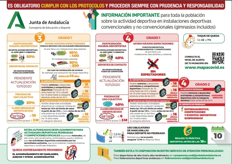 Así mismo, en el mismo BOJA se publicó la Orden de 8 de noviembre de 2020, por la que se modulan los niveles de alerta 3 y 4 como consecuencia de la situación crítica epidemiológica derivada del COVID-19 en la Comunidad Autónoma de Andalucía, donde se establecían una serie de restricciones temporales sobre diversas actividades, entre ellas, las deportivas. Además, en la noche de ayer, se publicó en BOJA una Corrección de errores de la Orden de 8 de noviembre de 2020, por la que se modulan los niveles de alerta 3 y 4 como consecuencia de la situación crítica epidemiológica derivada del COVID-19 en la Comunidad Autónoma de Andalucía, modificando y aclarando ciertos aspectos.