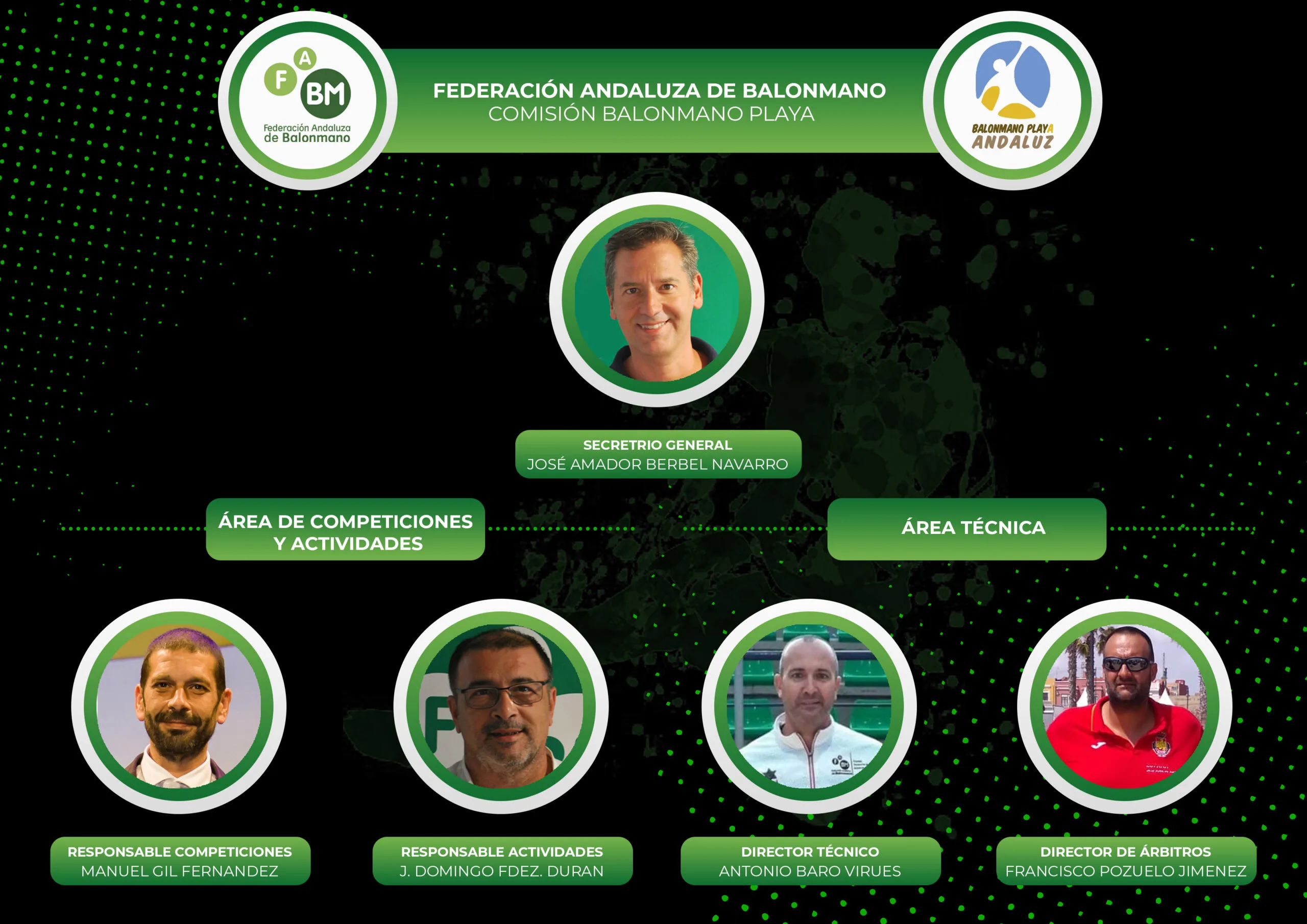La comisión cuyo fin es la promoción, práctica, organización y desarrollo del balonmano playa en el ámbito de la Comunidad Autónoma Andaluza, estará formada por las siguientes áreas y personas: