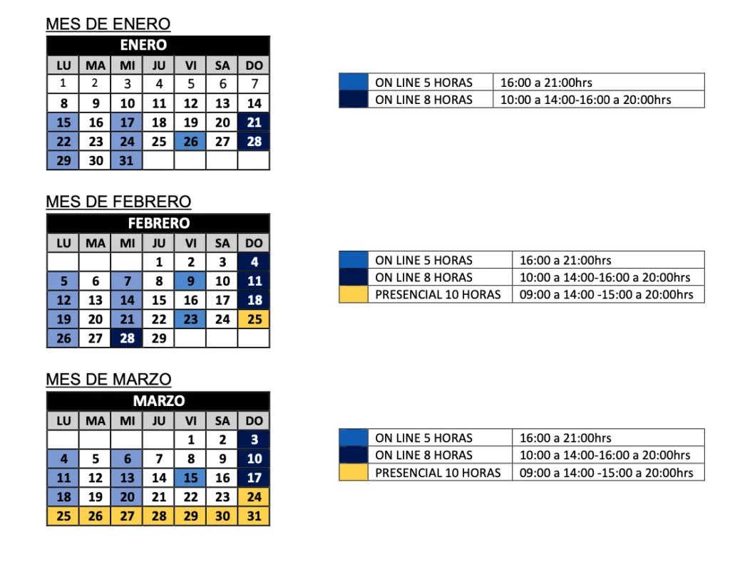 - Fase online: Clases grabadas disponibles por tiempo limitado en caso de falta justificada.