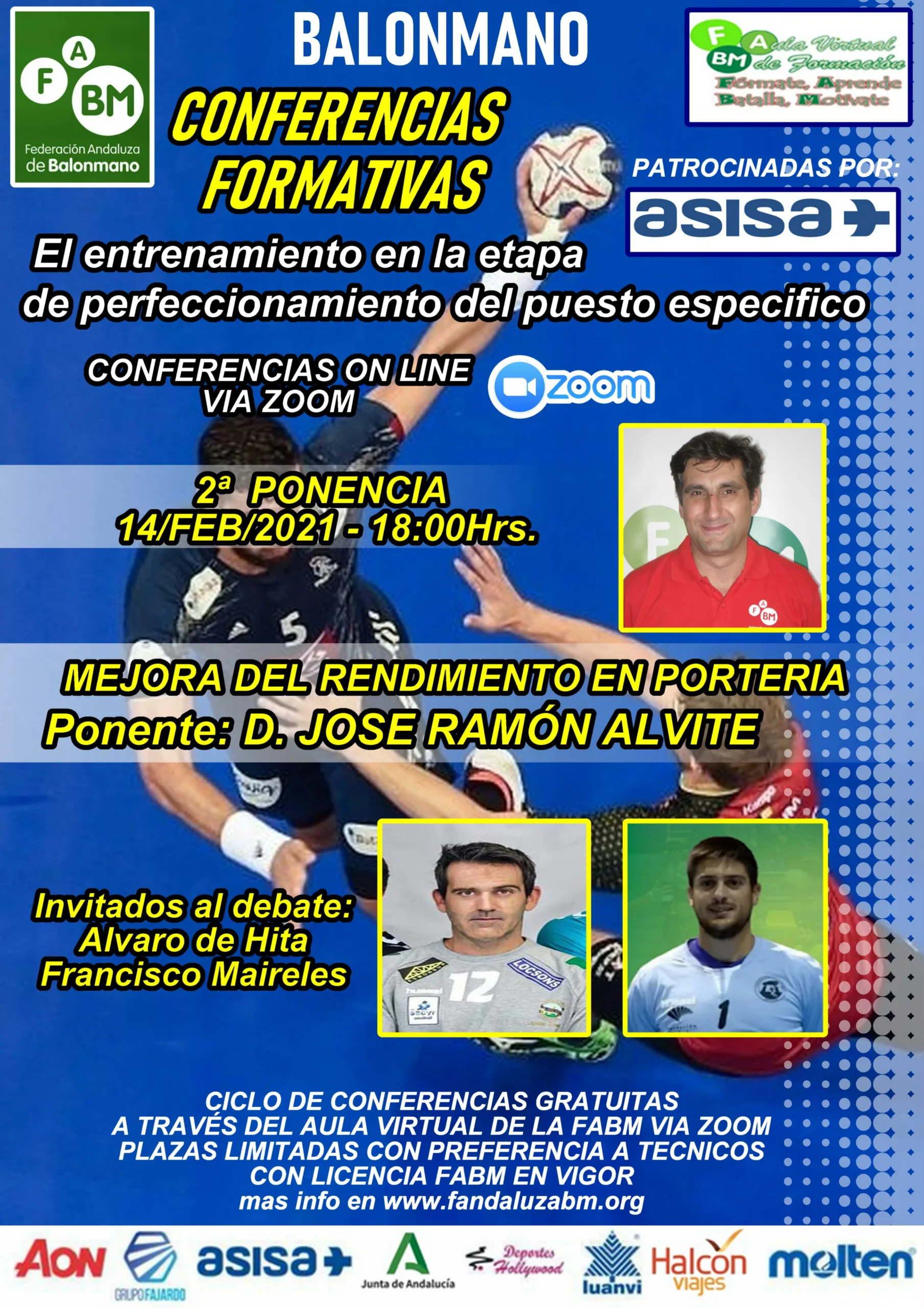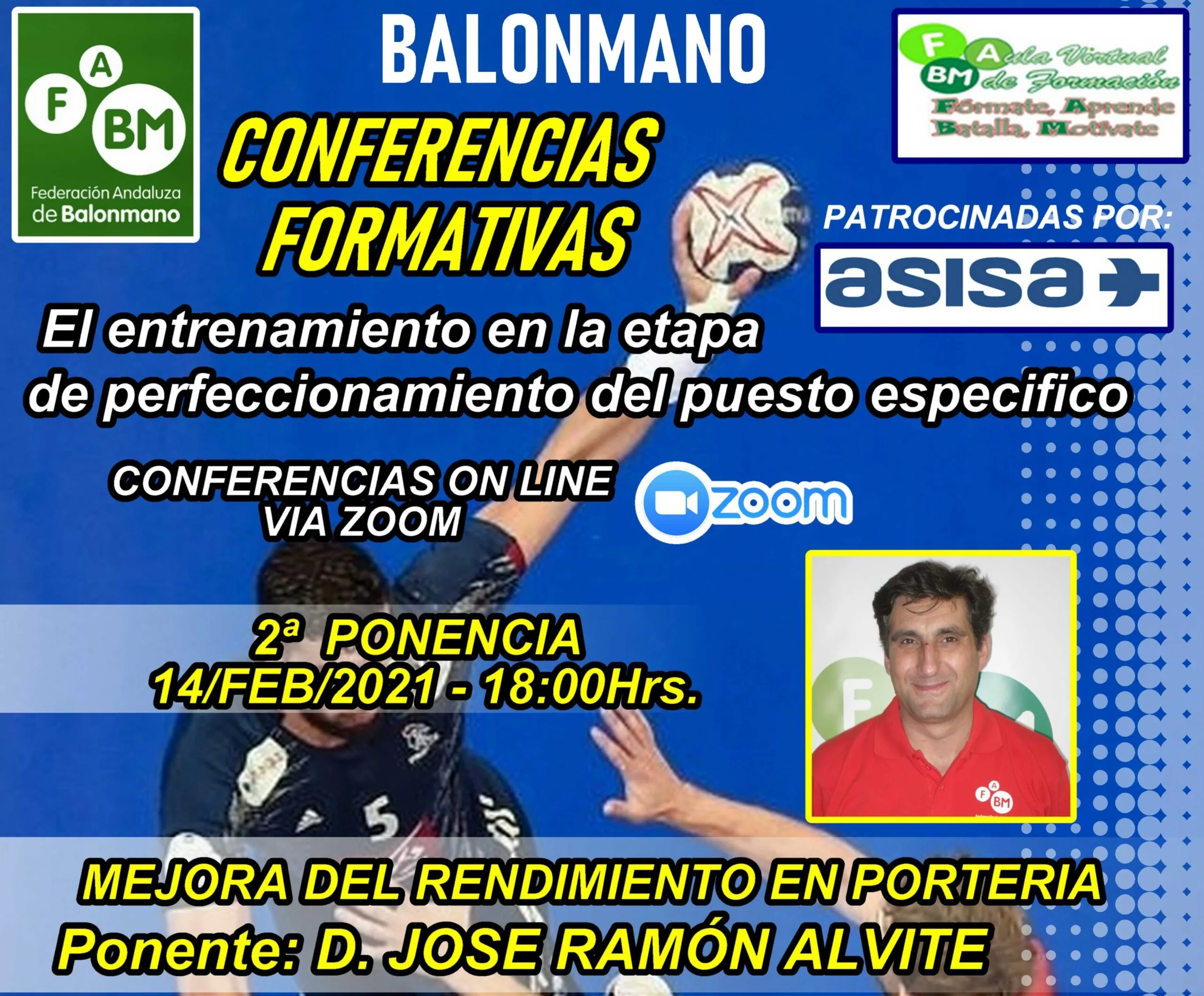 La próxima ponencia, será impartida por D. José Ramón Alvite, Entrenador Nacional, Técnico de porteros de la Federación Andaluza de Balonmano, y Director Deportivo del Club 1 Agosto de Luanda (Angola), sobre la mejora del rendimiento en portería, el próximo día 14 de febrero, a las 18:00 horas, vía zoom, y contará con la intervención de Alvaro de Hita, portero del equipo Asobal ANGEL XIMENEZ de Puente Genil, y de Francisco Maireles, portero hasta la temporada pasada, del BM. IBEROQUINOA ANTEQUERA, de División de Honor Plata.