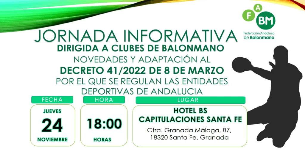 En relación a la entrada en vigor del Decreto 41/2022 de 8 de marzo, por el que se regulan las Entidades Deportivas de Andalucía y se establece la estructura y régimen de funcionamiento del Registro Andaluz de Entidades Deportivas», esta  Federación Andaluza de Balonmano, organizará una charla informativa dirigida a los responsables de clubes de balonmano de Andalucía,  sobre las novedades que establece el nuevo Decreto en relación a los clubes deportivos, el próximo día 24 de noviembre de 2022, a las 18:00 horas, en el Hotel BS Capitulaciones Santa Fe (Ctra. Granada-Málaga, 87 18320-Santa Fe (Granada)