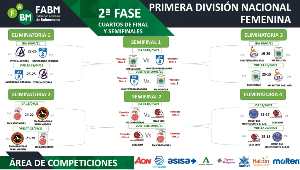 En la Primera División Nacional Femenina, los semifinalistas serán Universidad de Granada y BM Solucar, que se medirán en la primera de las eliminatorias, y Deza CBM y EM Carboneras, que harán lo propio en la segunda. Las granadinas hicieron valer su victoria en Algeciras para imponerse al Dypre Algeciras después de empatar a 25 goles en el encuentro de vuelta. El BM Solucar volvió vencer al AM System GAB Jaén en el partido de vuelta después de haberlo hecho ya en el de ida (19-29 y 25-15). Por su parte, EM Carboneras cayó en cancha de BM Maravillas Benalmádena, pero hizo valer los nueve goles de renta de la ida y Deza CBM fue el único equipo capaz de remontar después de ganar a Surjet BM Montequinto Ciudad de Dos Hermanas por siete tantos y remontar los seis de la ida.