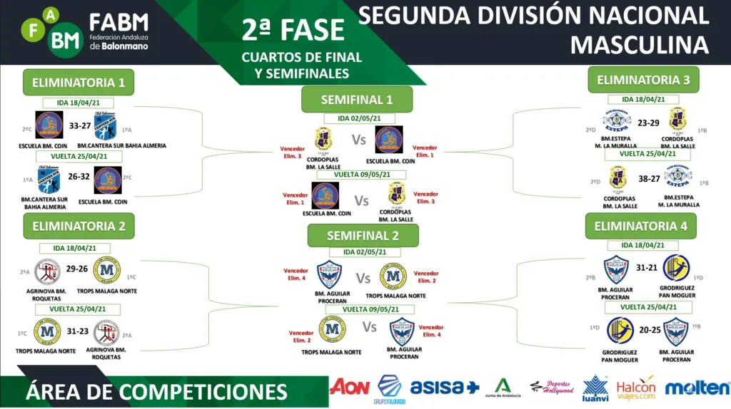 En cuanto a la Segunda División Nacional Masculina, los equipos clasificados son Cordoplas BM La Salle y Escuela BM Coín, rivales en la primera semifinal, y Trops Málaga Norte y BM Aguilar Proceran, que se medirán en la segunda. Los cordobeses eliminaron a BM Estepa Mantecados La Muralla tras repetir victoria en casa. Los de Coín también repitieron victoria ante su rival almeriense, el BM Cantera Sur Bahía de Almería. Además, BM Aguilar Proceran ganó en la cancha del GRodriguez PAN Moguer después de haberlo hecho ya en la suya y Trops Málaga Norte le dio la vuelta a su eliminatoria en el encuentro del pasado fin de semana contra Agrinova BM Roquetas.