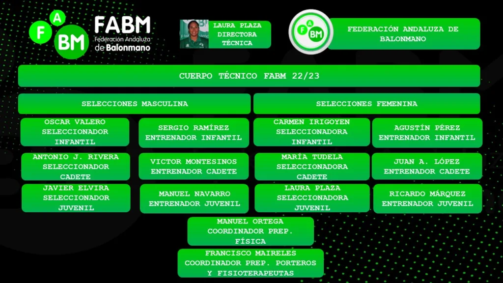 Junto a ella, la Federación Andaluza de Balonmano se complace en presentar al cuerpo técnico de las Selecciones Andaluzas de categorías infantil, cadete y juvenil, tanto masculino como femenino. Estas duplas de seleccionadores y entrenadores serán las que se encargarán de la preparación del próximo Campeonato de España 2023, que se va a celebrar en la Costa Blanca y con epicentro en Benidorm.