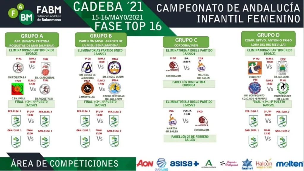 Por último, el Grupo D, que se juega en Lora del Río, estará compuesto por BM Lepe, BM Solúcar, BM Montequinto Ciudad de Dos Hermanas y Prointegrada BM Lauro. Los dos primeros equipos jugarán su semifinal a las 10:30 h. para definir un puesto en la final del día siguiente y en el Top8. Por otra parte, quinteñas y loreñas se medirán dos horas después, a las 12:30 h. Además, el tercer y cuarto puesto se jugará el domingo a las 10:30 h. y la final a las 12:30 h.