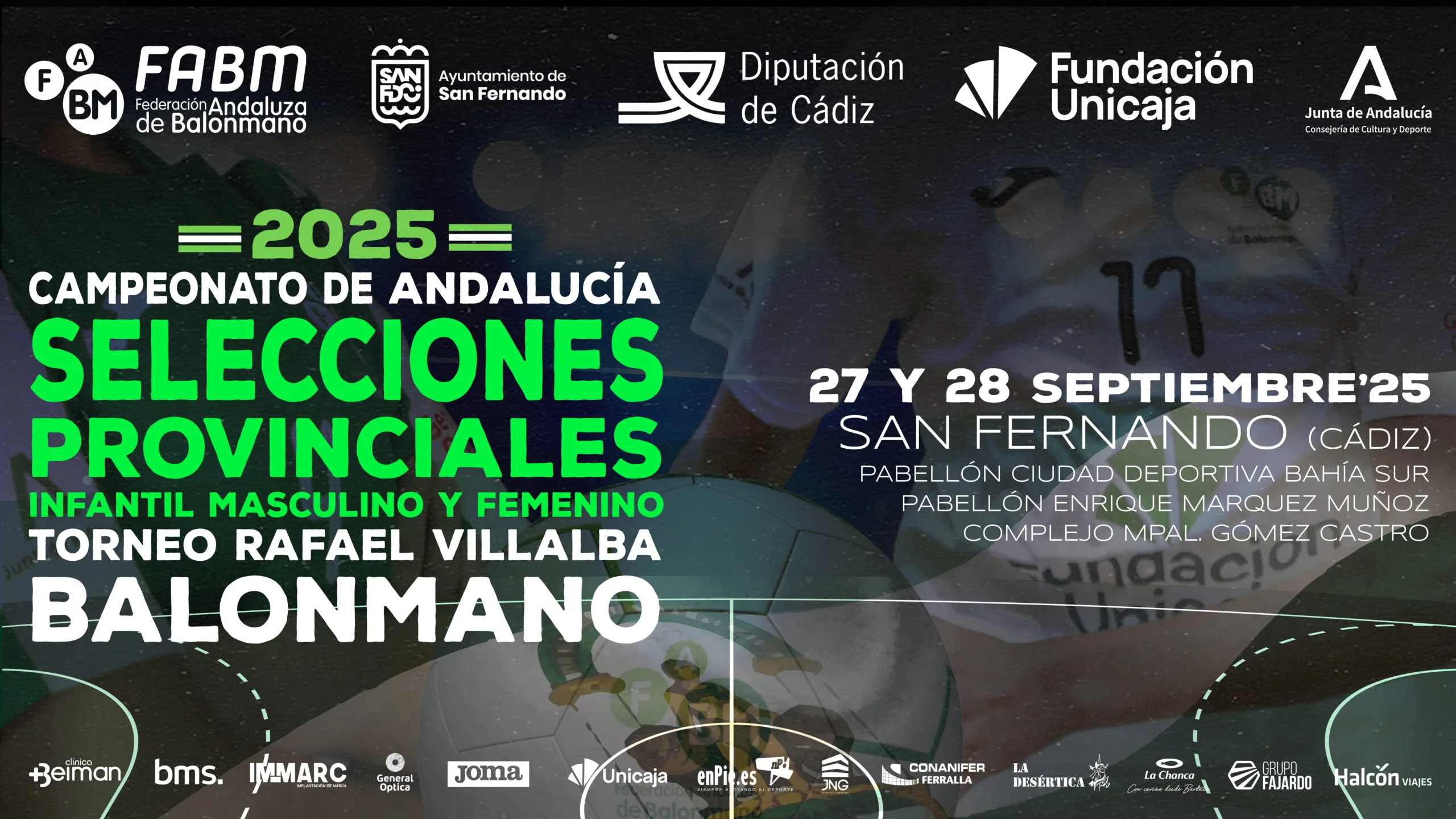Desde la Federación Andaluza de Balonmano queremos dar las gracias al Excmo. Ayuntamiento de San Fernando y a la Diputación de Cádiz por su apoyo una temporada más a nuestro balonmano base. Asimismo, al Excmo. Ayuntamiento de Chiclana por su colaboración y a todos los patrocinadores que nos acompañan esta temporada 2025-2026.
